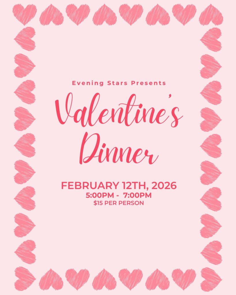 Join us on Thursday, February 12th for our Valentine’s Dinner! This enchanting evening is being catered by Marino’s Deli, with tickets at just $15 per person.